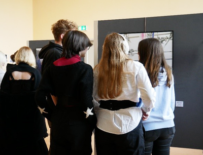 Viele Klassen und Lehrkräfte besuchten die Ausstellung in den folgenden Tagen. Bis Freitag, den 25.11., war sie frei zugänglich. Nach dem Abbau fanden die Leinwände ein neues Zuhause im Schulbüro und im Flur der Schulleitung.