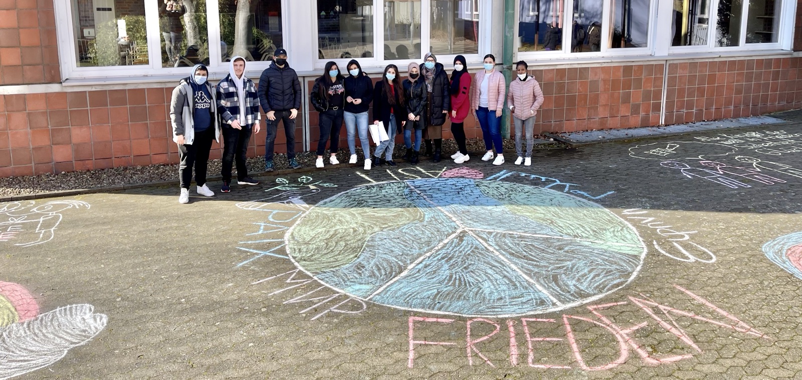 Diese Forderung nach einer friedlichen Zukunft, in der wir gemeinsam leben und lernen können, hat die AV1IF1 in einer Straßenmalerei auf dem Schulhof Ausdruck verliehen. Einige Schülerinnen und Schüler des Leo haben sich spontan angeschlossen: „Ich auch!“ – das ist ein klares Statement.